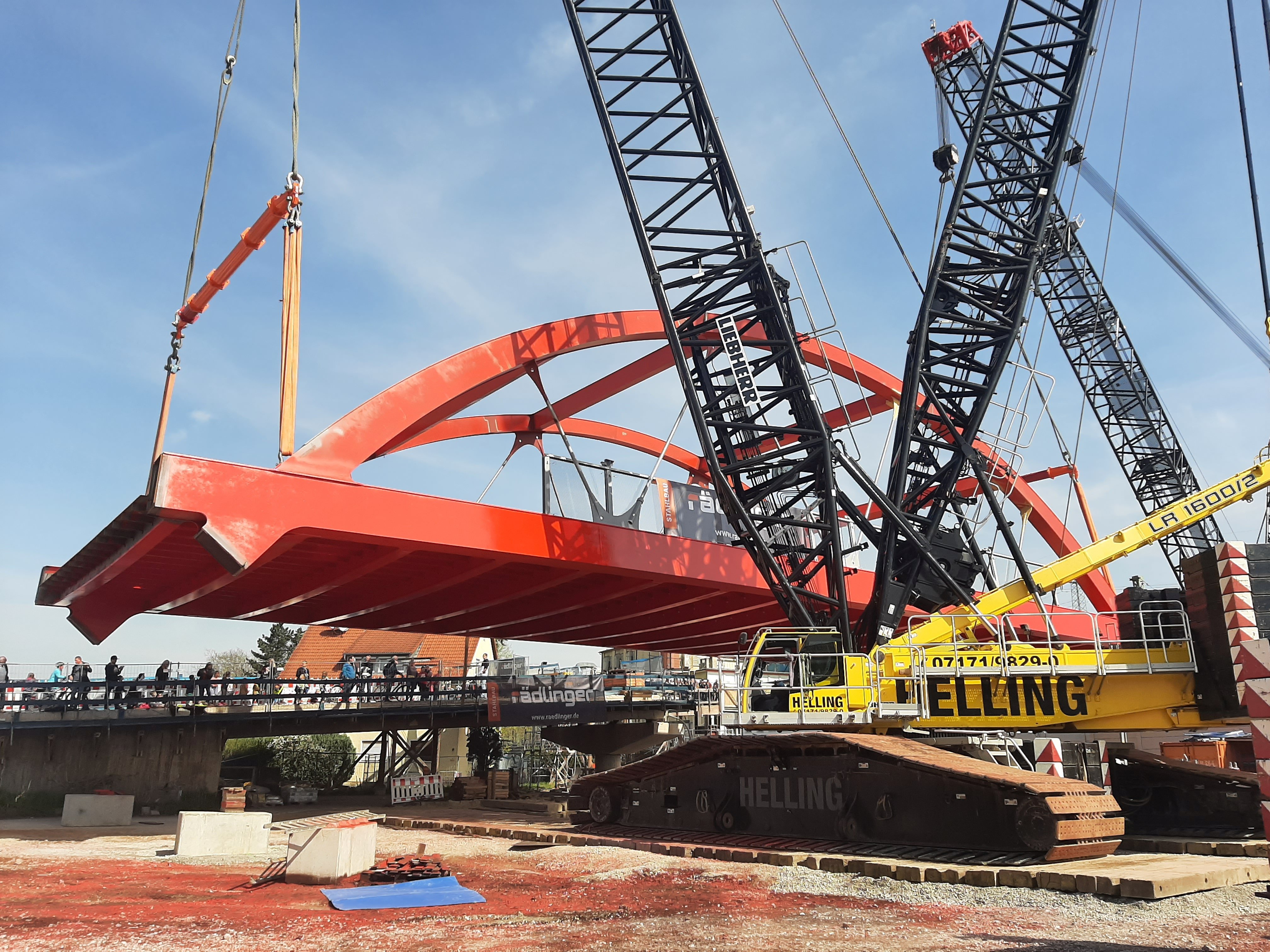 Im April 2022 durften wir in Forchheim die Piastenbrücke mit einem Gesamtgewicht von circa 460t mit unseren zwei RK 600 einheben.